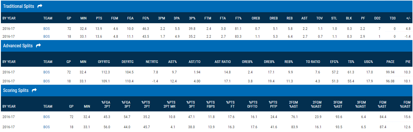 У Томаса в плейфф упал TS% c 62,5% до 56,3, а NETRTG скатился до -2,6, то есть с Томасом на площадке Бостон пропускал больше, чем забивал. Ирвинг же прибавил в атаке (+4,1 OFFRTG).