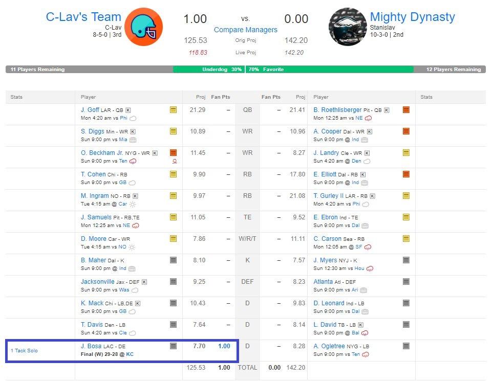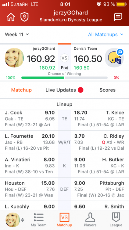 C-Lav Опубликовано 12 августа, 2015 Автор Опубликовано 12 августа, 2015 ...считаю что за сэк надо давать больше очков хотя бы 2 очказа перехват хотя бы 3просто если мы играем по стандартным ренкингам индивидуальной защиты, то она реально стоит очень малона мой взгляд...Перечитал ещё раз - так у нас как раз сейчас и стоят такие настройки. Т.е. по умолчанию за сэк 2 очка, за перехват - 3 очка.Плюс ещё баллы за спровоцированные фамблы и т.д. Ниже привожу всю раскладку. Думаете, всё равно недосточтоно? По прогнозируемым цифрам лучшие защитники будут получать по 150+ баллов. Это сравнимо с ресиверами, которых мы будем выбирать во 2-3 раундах.Tackle Solo 1 Tackle Assist 0.5 Sack 2 Interception 3 Fumble Force 2 Fumble Recovery 2 Defensive Touchdown 6 Safety 2 Pass Defended 1 Block Kick 2 ---Добавил ещё два опроса:1. По количеству IR-слотов - два, один или совсем без них.2. По драфт-лотерее: Каким образом будем определять порядок на драфте-2016 года и далее.Ссылка на все опросы ниже. Прошу высказываться:http://football.fantasysports.yahoo.com/f1/569165/messages---По процедуре драфта - сейчас терпеливо ждём Дромоса.Если до вечера от него всё также ничего, осуществим замену. Если сейчас это читает кто-нибудь из желающих присоединиться к нашей династии, прошу отозваться. Пока же в качестве замены никого... 0 Цитата