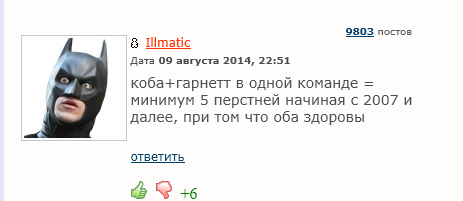 Oh Long Johnson Опубликовано 22 ноября, 2016 Опубликовано 22 ноября, 2016 17 часов назад, Evil Genius сказал: В 20 Ноябрь 2016 г. в 11:25 AM, God save me сказал: это его типа моднейший троллинг на Пирса, Гарнетта или Аллена ну как бы втроем на одного копу потянут хотя на троих гаек меньше, чем у копы мвп столько же и мвп финала меньше как-то я не думал раньше, что они такие убогие Не, ну это понятно, что Копа лучше Пирса, Гарнетта и Аллена вместе взятых. Но тут возникакет вопрос - Копа ведь МВП-2008, в первых пятёрках НБА по итогу сезона. Тащила, клатчер, инстинкт убийцы и всё такое... Где тогда титул-2008, как можно было так слиться в финале какому-то креслу-каталке? 0 Цитата