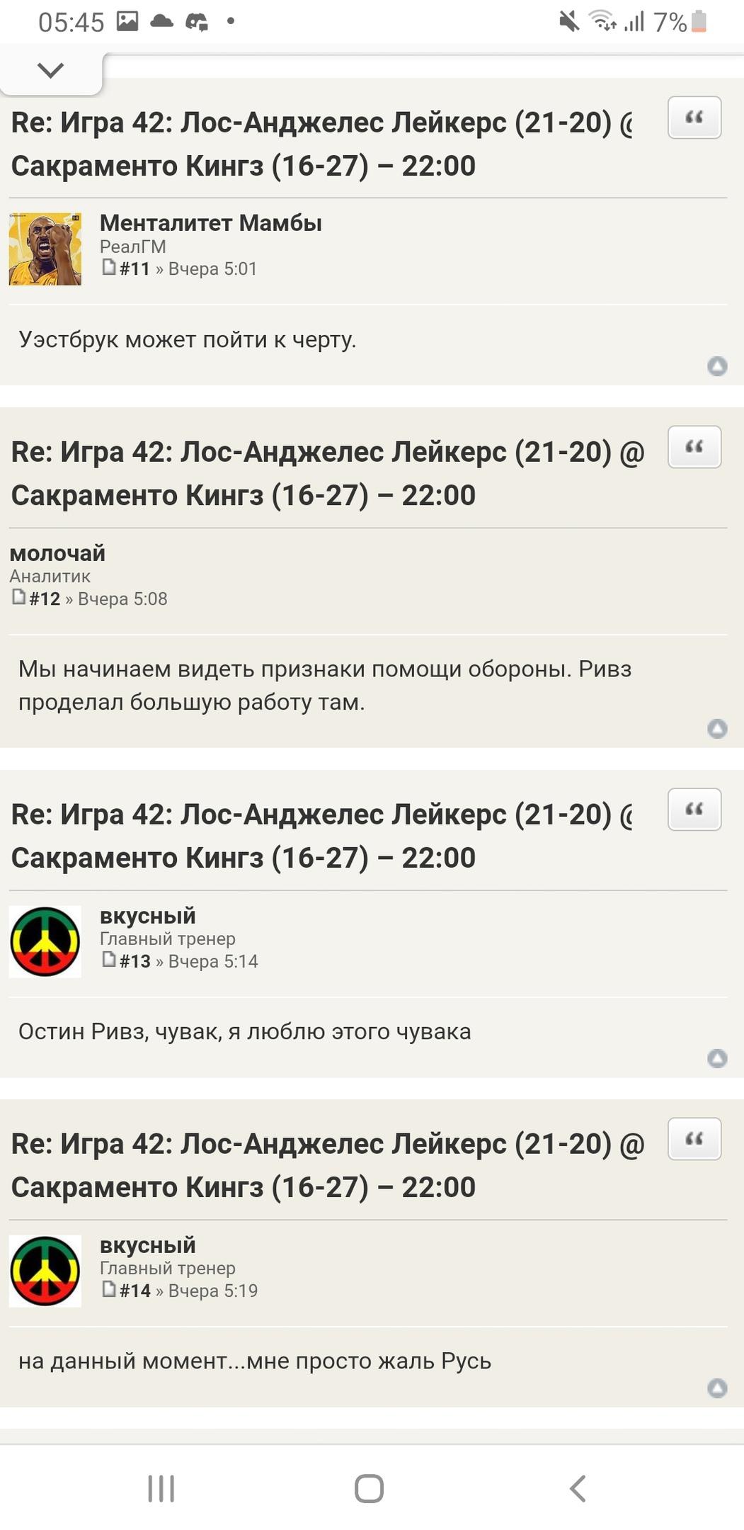 MuGGs Опубликовано 18 января, 2022 Опубликовано 18 января, 2022 У "Лейкерс" есть небольшой запас прочности, поэтому пусть не особо расстраивают болельщиков выступления Аризы и вообще команды в 3-ьей четверти матчей. Если ЛеБрон или Уэстбрук не способны что-то показать, кто-то может наковырять очков и если команда будет играть в таком же духе, то можно через раз доставлять победы. Чтобы побеждать всё-время, нужна синхронизация всех эшелонов команды. 1 Цитата