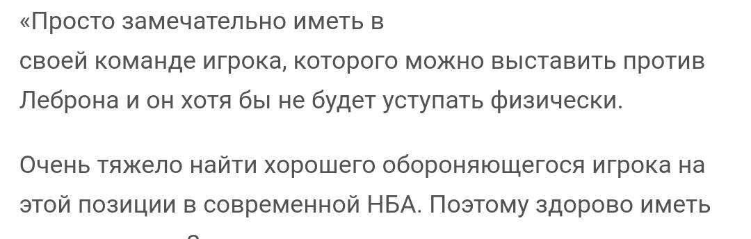 «Просто замечательно иметь в своей команде игрока, которого можно выставить против Леброна и он хотя бы не будет уступать физически.