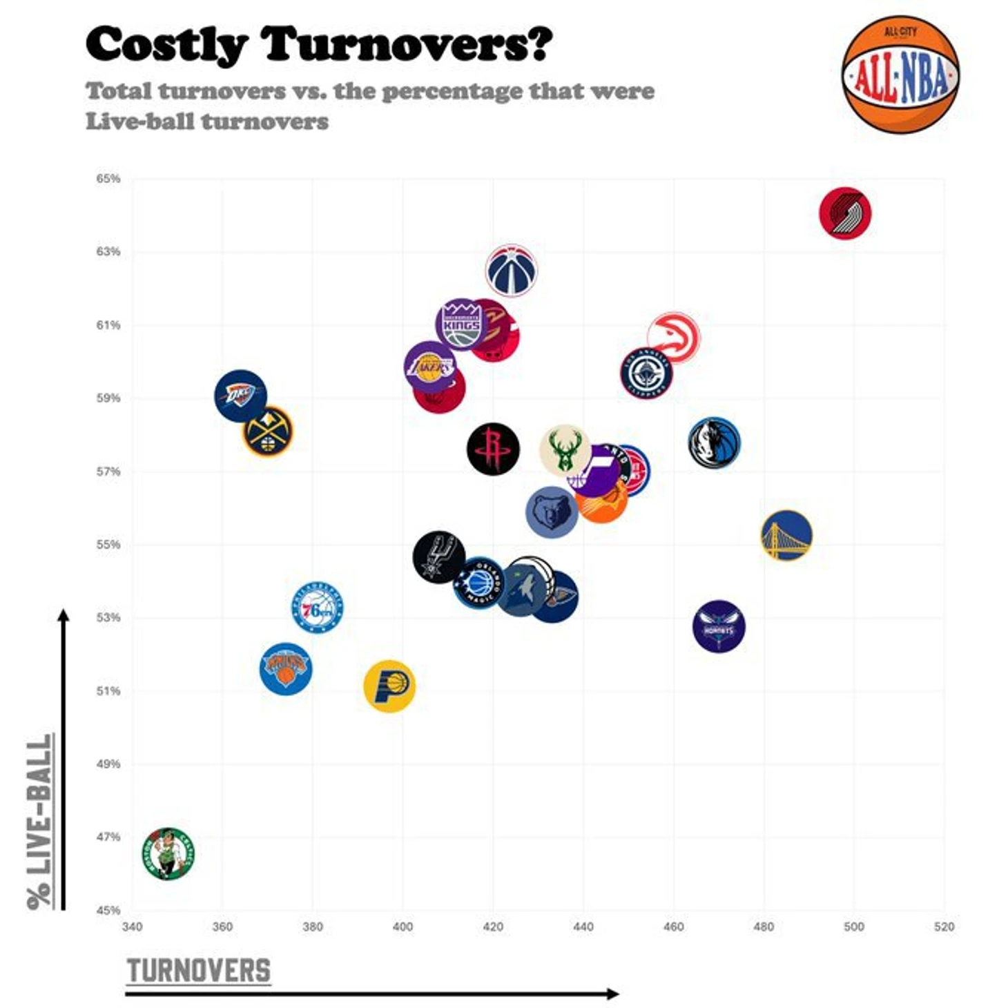 Самый высокий процент таких потерь у «Портленда». При этом «Трэйл Блэйзерс» лидируют в НБА и по общему числу потерь мяча.