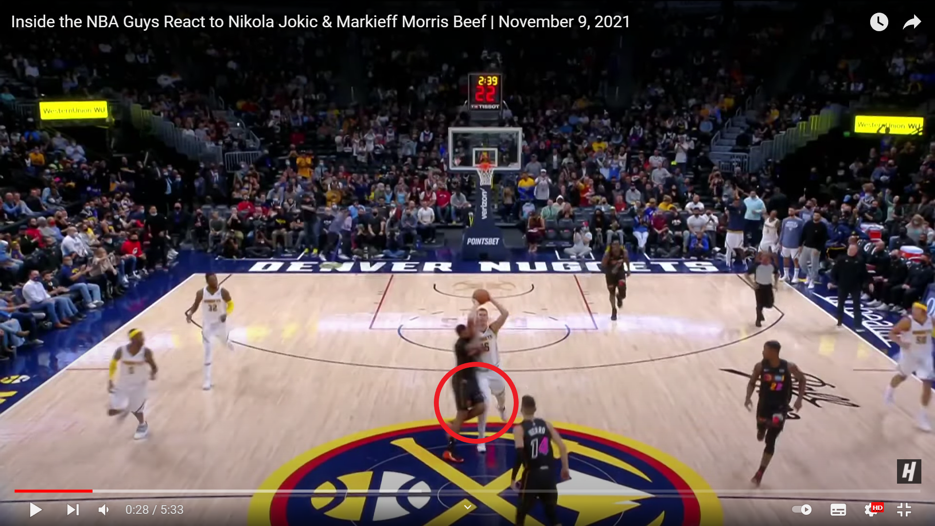 Форвард «Майами» Маркифф Моррис умышленно сфолил на Йокиче в центре площадки. Серб в ответ нанес оппоненту сильный удар плечом в область спины. Моррис оказался на паркете и через некоторое время его унесли с площадки на носилках. Оба игрока были удалены.
