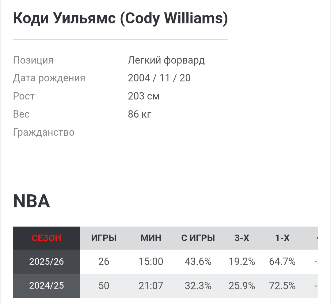 Легкий форвард «Юты» Коди Уильямс на прошлой неделе закончил матч против «Шарлотт» (95:150) с худшим «+/-» в истории НБА. Показатель 21-летнего баскетболиста составил «-60».