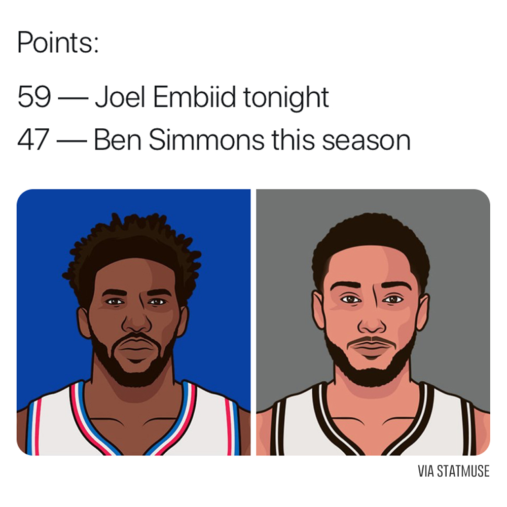 Эмбиид набрал 26 из 27 очков «76-х» в четвертой четверти. Он стал первым в истории НБА, кто имеет в активе как минимум 50 очков, 10 подборов, 5 передач и 5 блок-шотов с момента, как последние стали входить в официальную статистику лиги в 1973 году.