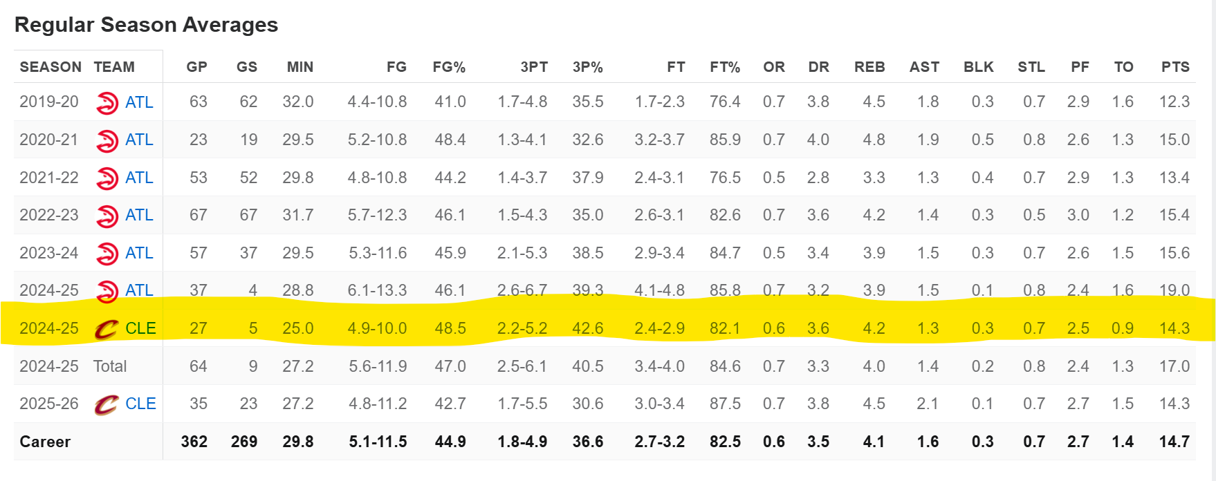 На минуточку напомню, что он перешёл в Кавс в середине прошлого сезона на пике карьеры, показывая лучшие цифры. Так вот вторую половину того сезона в Кливленде он играл менее важную роль, чем в Атланте, но при этом цифры были просто топовые.
