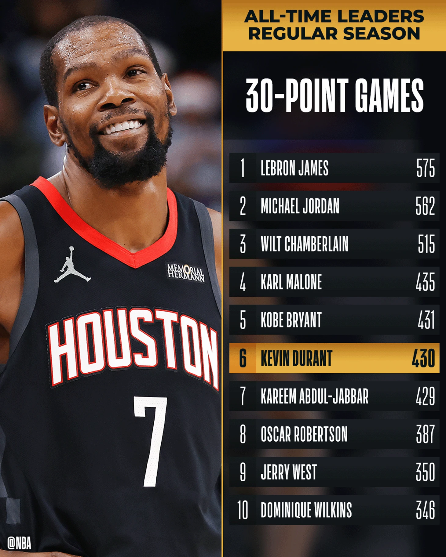 Этот матч стал для Дюрэнта 430-м в карьере с 30 очками и позволил обойти Карима Абдул-Джаббара (429).