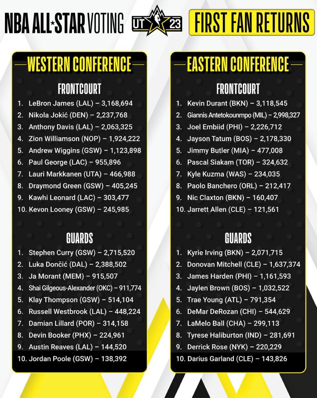 Форвард «Лейкерс» Леброн Джеймс является абсолютным лидером в голосовании (3 168 694 голоса), Кевин Дюрэнт («Бруклин») лидирует среди игроков Восточной конференции (3 118 545).