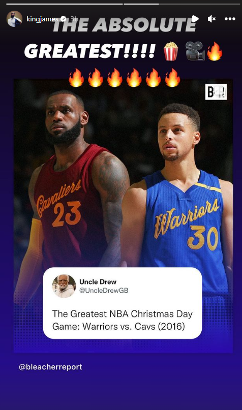Джеймс опубликовал в соцсети картинку Bleacher Report, на которой говорится, что противостояние «Кавальерс» – «Уорриорз» 2016 года – это лучший рождественский матч всех времен.