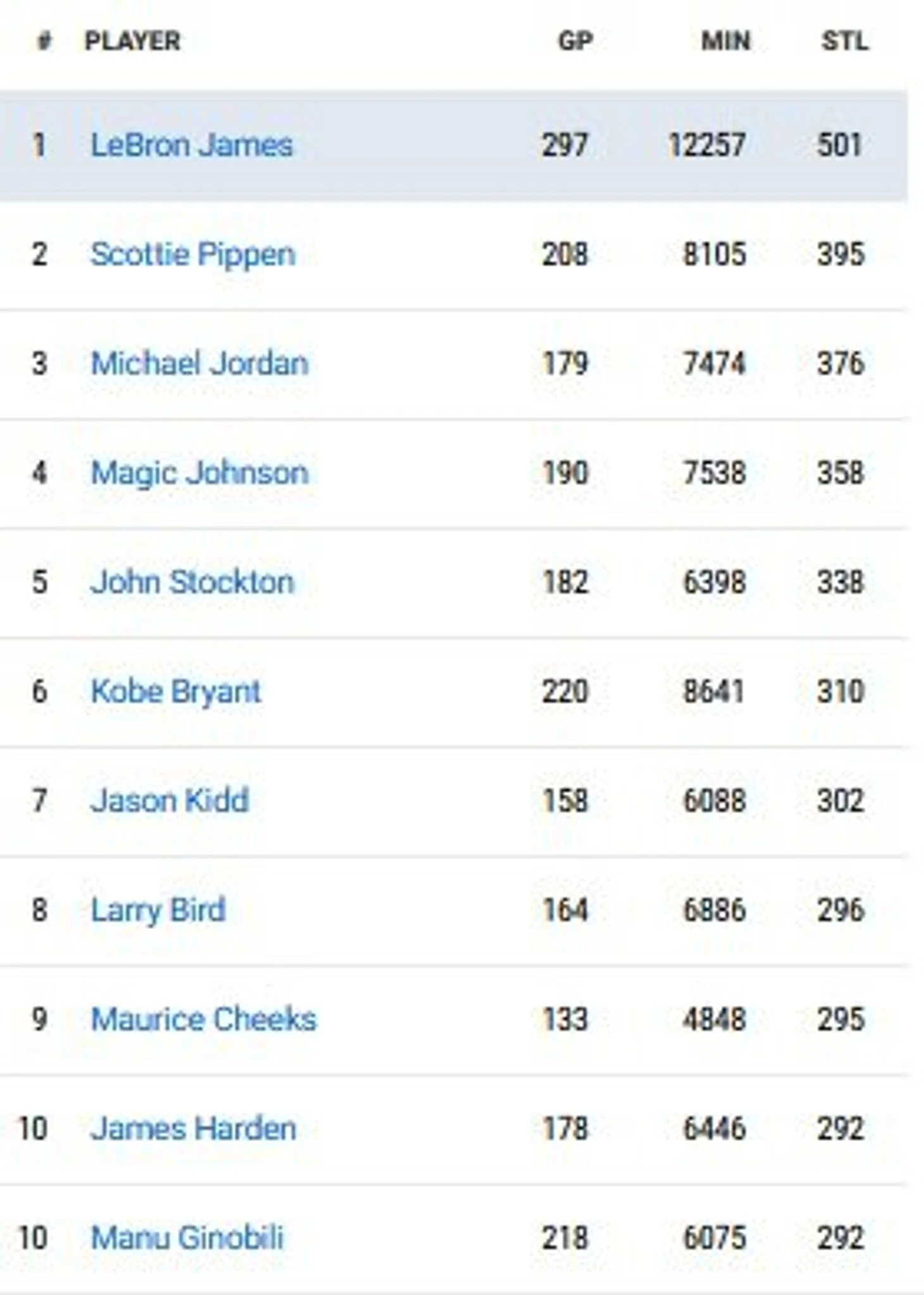 Форвард «Лейкерс» Леброн Джеймс сделал 2 перехвата в матче против «Хьюстона» и довел свой показатель в плей-офф за карьеру до 501. Джеймс давно лидирует в рейтинге, а теперь стал первым, кому удалось взять планку в 500 перехватов.