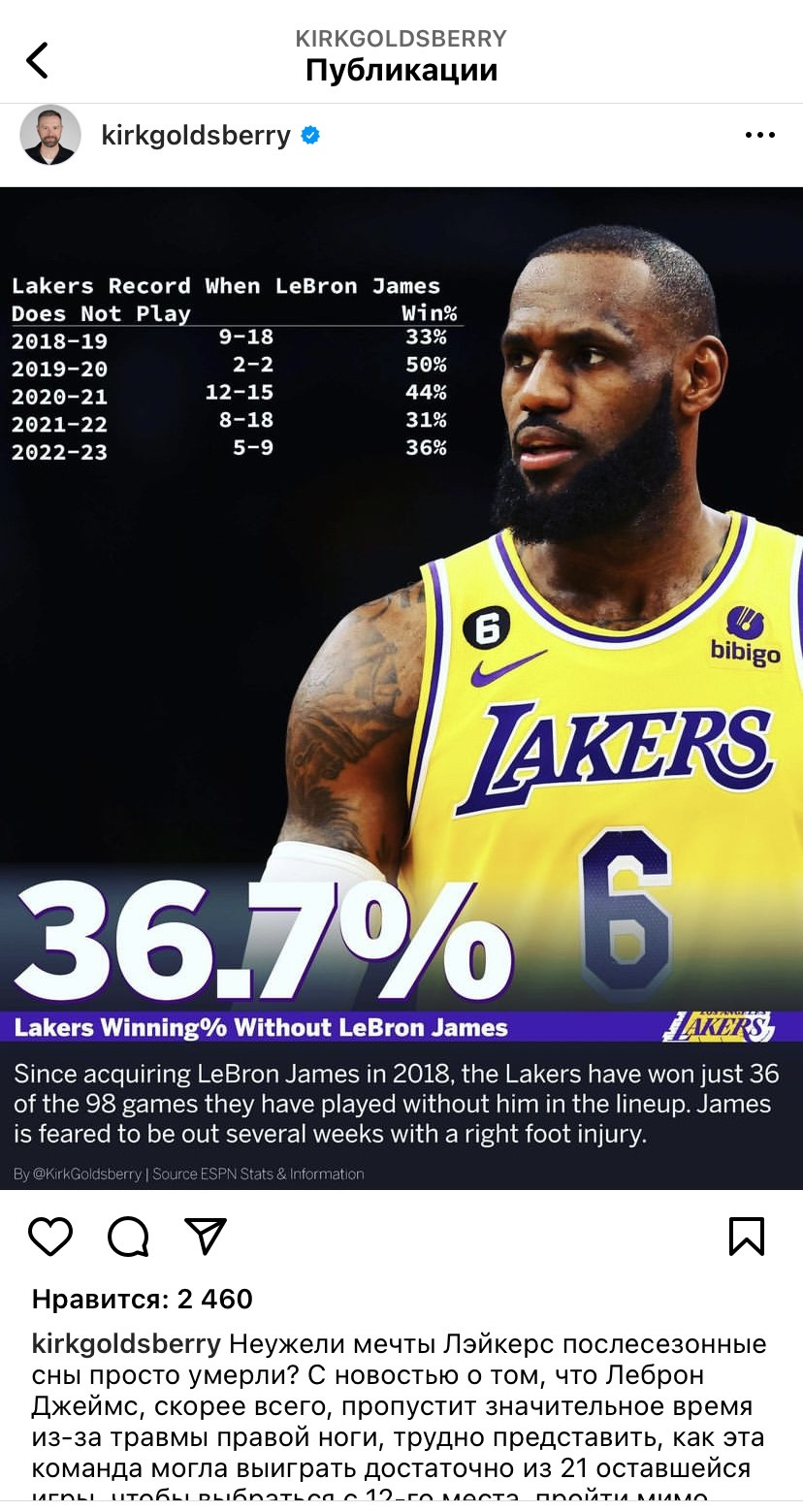 «Лейкерс» занимают 12-е место на Западе с результатом 29-32. В текущем сезоне у команды показатель 5-9 в матчах без Джеймса в составе.