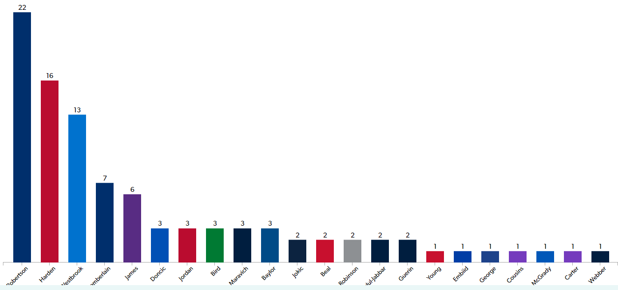 Словенец поднялся на пятое место в истории лиги и уступает только Джеймсу Хардену (35), Леброну Джеймсу (37), Расселлу Уэстбруку (48) и Оскару Робертсону (106).