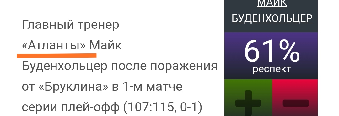 Главный тренер «Атланты» Майк Буденхольцер после поражения от «Бруклина» в 1-м матче серии плей-офф (107:115, 0-1) заявил, что его стратегия состоит в том, чтобы сохранять своих звезд свежими, используя глубину состава.