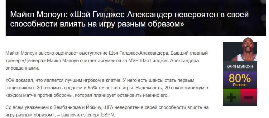 Майкл Мэлоун высоко оценивает выступление Шэя Гилджес-Александера. Бывший главный тренер «Денвера» Майкл Мэлоун считает аргументы за MVP Шэя Гилджес-Александера оправданными.