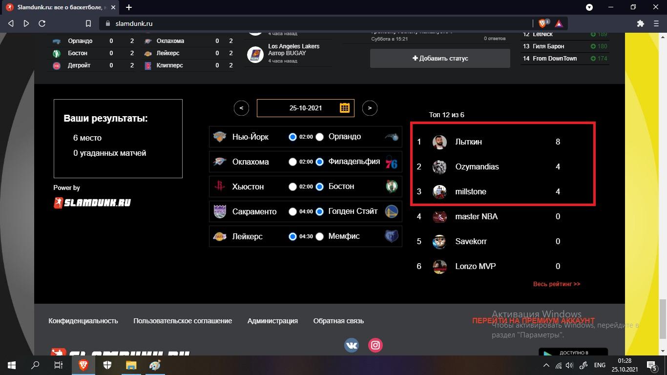 Лейкерс: Дэвис (22 + 8 подборов + 4 блокшотов), Джеймс (19), Уэстбрук (13 + 7 подборов + 13 передач + 4 перехватов - 9 потерь), Бэйзмор (11), Джордан (8 + 8 подборов) - старт; Энтони (28), Ховард (4), Брэдли (0), Монк (12), Ривз (4)