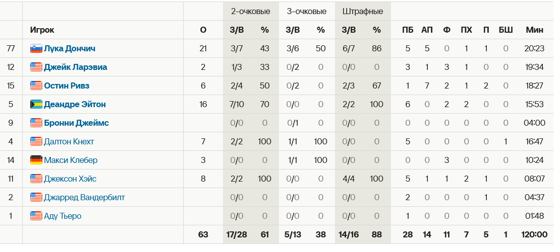 Лейкерс: Дончич (41 + 9 подборов), Ривз (25 + 8 передач), Эйтон (20 + 10 подборов), Ларэвиа (4), Джеймс (0) - старт; Клебер (3), Вандербилт (0), Кнехт (9), Хэйс (10), Смит-младший (3)