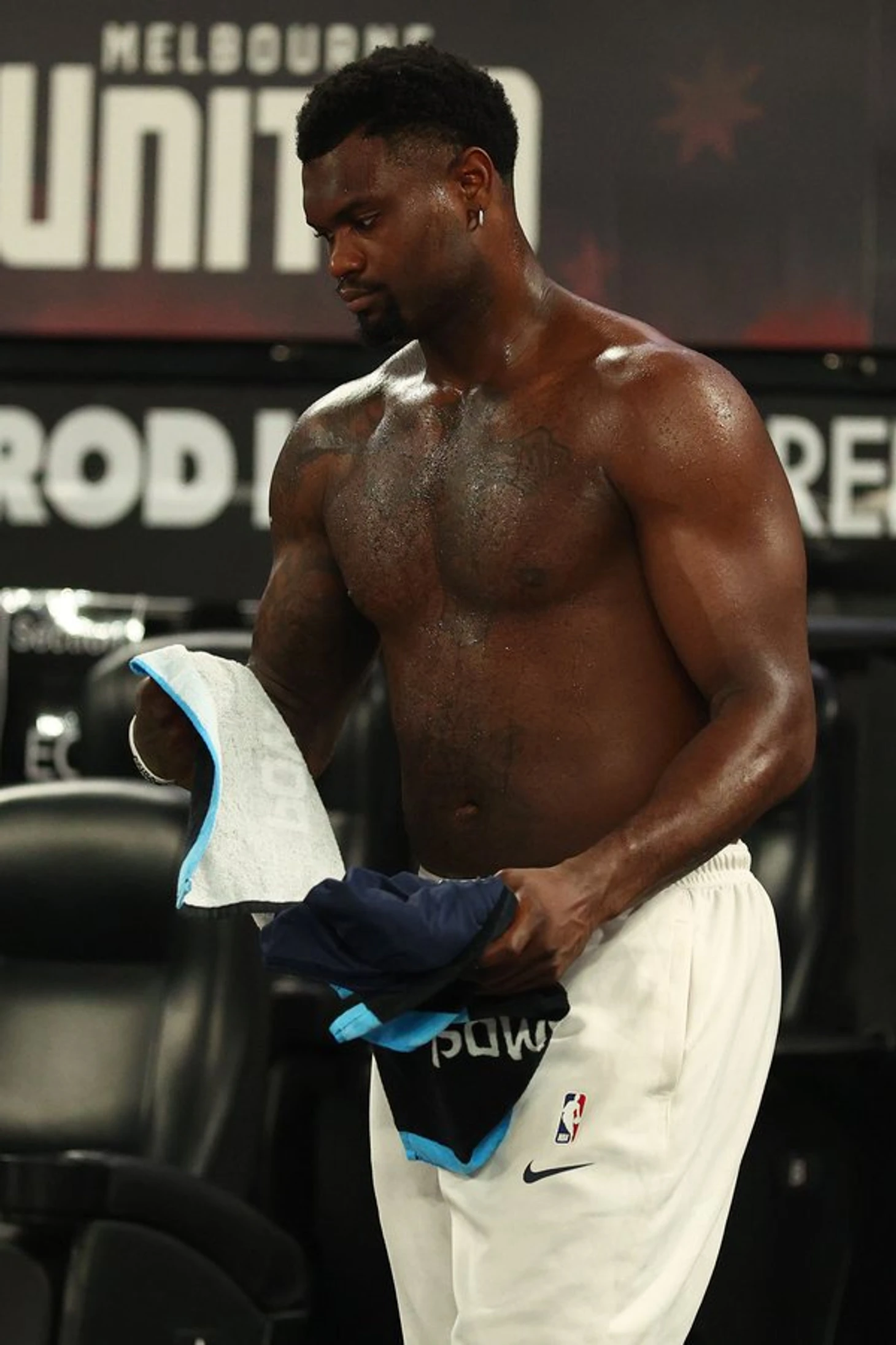 Звездный форвард «Пеликанс» предстал с голым торсом во время тренировки в Австралии, где его команда сыграет в предсезонных матчах.