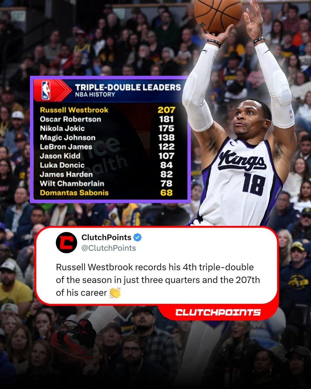 Разыгрывающий «Сакраменто» Расселл Уэстбрук стал самым результативным игроком своей команды в матче с «Индианой», оформив свой 4-й за сезон и 207-й в карьере трипл-дабл.