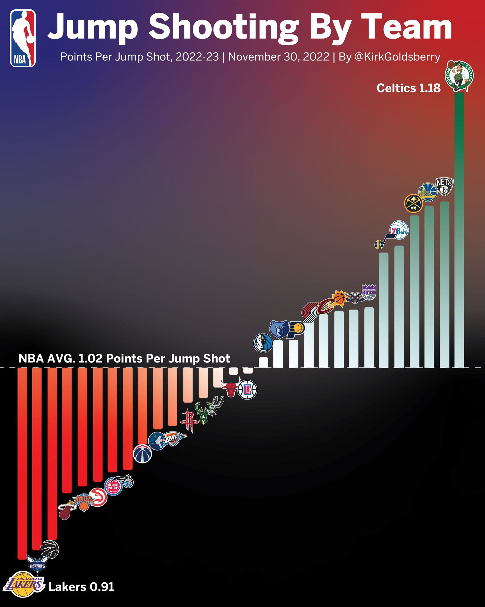 «Бостон» показывает лучшую в НБА эффективность бросков в прыжке (Jump Shots), набирая в среднем по 1,18 очка за одну такую попытку.