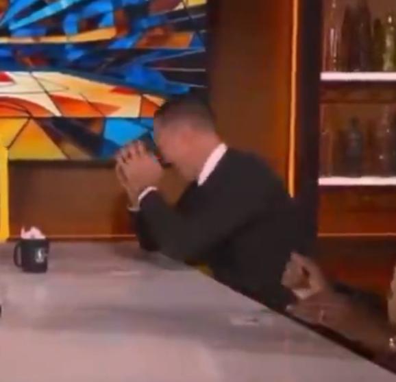 Прославленный разыгрывающий случайно попал бумажкой в грудь соведущей Тэйлор Рукс, после чего спрятался под стол.