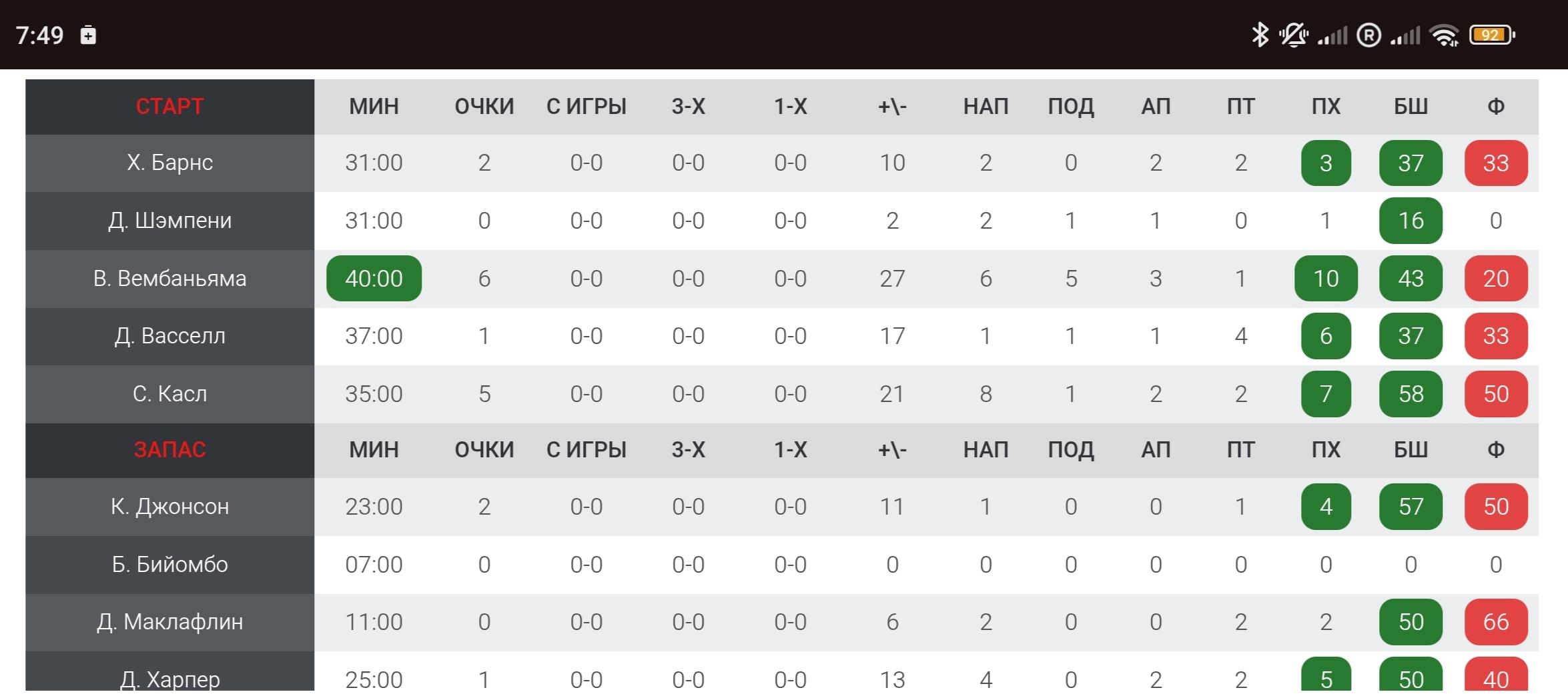 Виктор Вембаньяма отметился 27 очками (10 из 23 с игры, 1 из 5 трехочковых, 6 из 8 штрафных), 18 подборами, 6 передачами и 5 блок-шотами. Вембаньяма заблокировал хотя бы один бросок в 90-й игре подряд, что является четвертой по продолжительности серией в истории лиги.