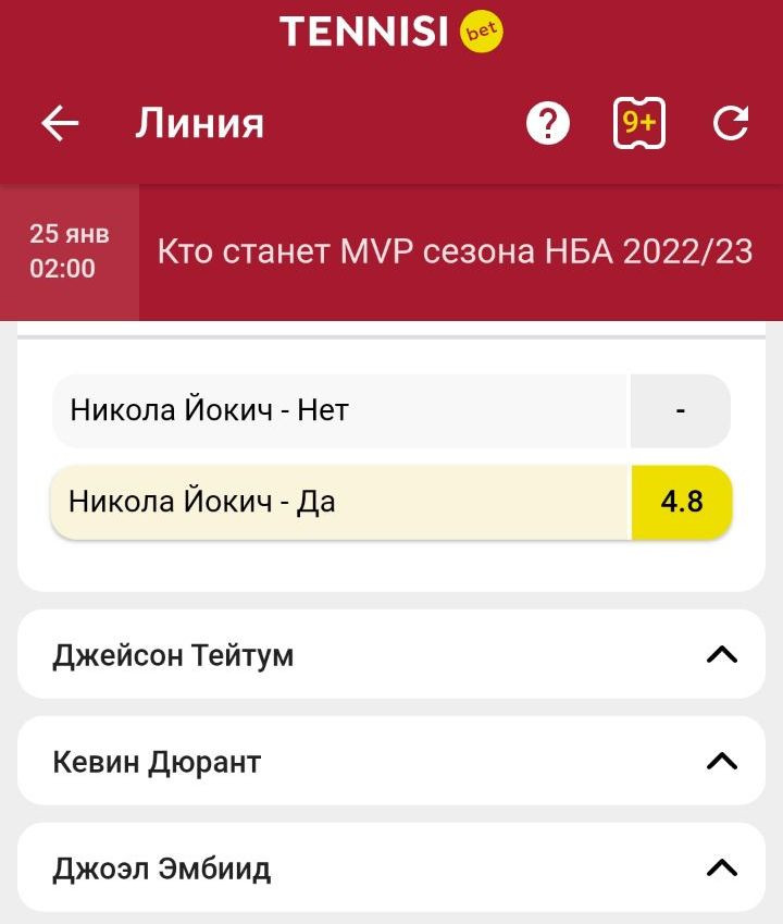 Наши друзья из TENNISI.bet дают кэф 4.8 на то, что Никола Йокич станет MVP текущего сезона.