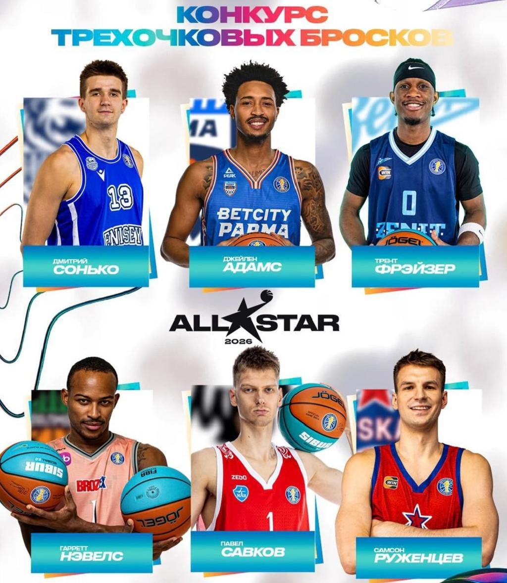 Участники конкурса трехочковых: Джейлен Адамс («Бетсити Парма»), Самсон Руженцев (ЦСКА), Гарретт Нэвельс («Уралмаш»), Дмитрий Сонько («Енисей»), Павел Савков (МБА-МАИ) и Трент Фрэйзер («Зенит»).