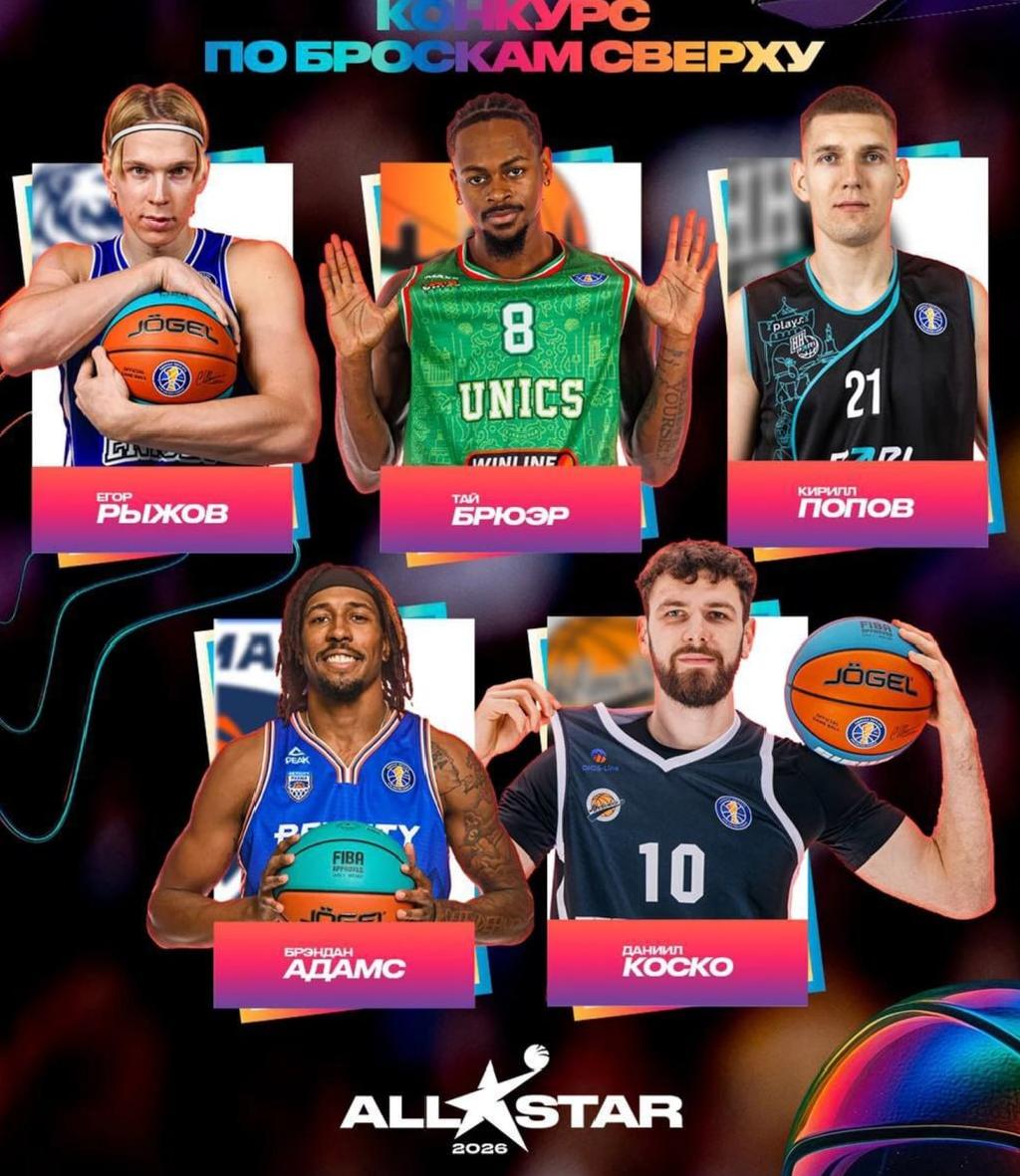 Участники конкурса по броскам сверху: Егор Рыжов («Енисей»), Даниил Коско («Автодор»), Кирилл Попов («Пари Нижний Новгород»), Брендан Адамс («Бетсити Парма») и Тайрон Брюэр (УНИКС).