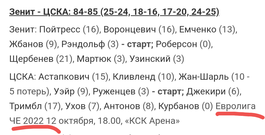 ЦСКА: Астапкович (15), Кливленд (10), Жан-Шарль (10 - 5 потерь), Уэйр (9), Руженцев (3) - старт; Джекири (6), Тримбл (17), Ухов (7), Антонов (8), Курбанов (0) Евролига ЧЕ 2022 12 октября, 18.00, «КСК Арена»